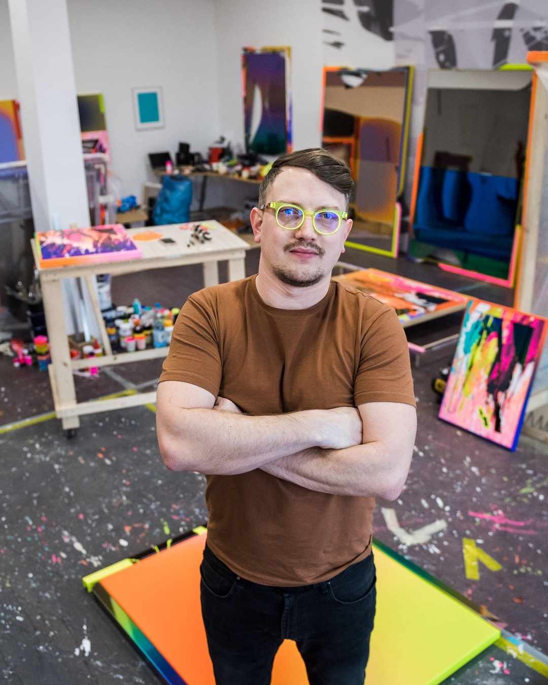 Initially inspired by the architecture of Budapest, a city that he has spent the majority of his life residing in, Nemes’s practice is rooted in the colourful abstraction of buildings. Since this early work, and after moving to London, Nemes has been heavily influenced by techno subcultures, continuing to create abstracted colourful works whilst attempting to duplicate the atmosphere and experience of rave culture, creating a disintegration and rearrangement of the pictorial state. Made using a range of materials, Nemes’s artworks are eager to expand and bend, referencing the escapist counter cultures associated with rave scenes, creating multisensory, diverse experiences.