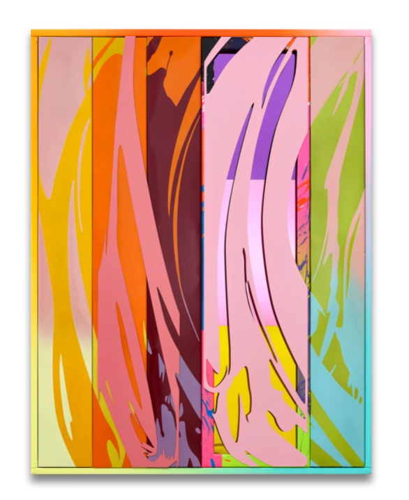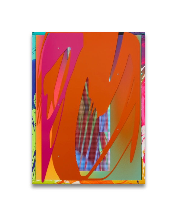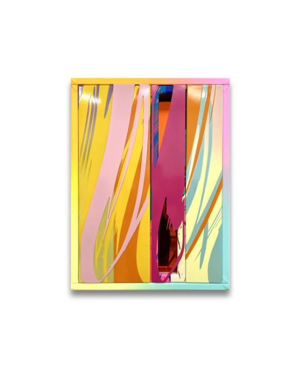 Irreversible Paintings 12, 2025, Porcelain enamel on steel plate, laser-cut and powder-coated stainless steel, mirror plexiglass, acrylic, canvas, wood, MDF, 83 x 62,5 x 8 cm