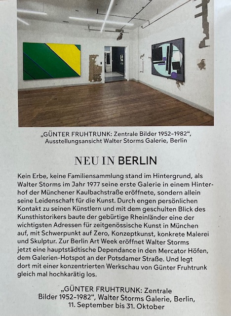 In Berlin war Günter Fruhtrunk zu seinen Lebzeiten nicht allzu präsent. Die verdienstvolle Galerie Bossin, die sich ganz der konkreten Kunst widmete und 1985 geschlossen wurde, zeigte Fruhtrunk in Einzelausstellungen 1977, 79 und 80. Kurz vor seinem Tod stiftete Günter Fruhtrunk sein monumentales Gemälde „Forderung.Lichtgrundiertes Dunkel“ dem Verein der Freunde der Nationalgalerie Berlin, um den geplanten Ankauf des Bildes „Who´s Afraid of Red, Yellow and Blue“ von Barnett Newman zu unterstützen. Es war 1982 ein einzigartiger Vorgang: beste deutsche Künstler stifteten Werke, um die Erwerbung einer Ikone amerikanischer Kunst zu ermöglichen, dokumentiert in einer von Wolf Vostell gestalteten bibliophilen Publikation. 1993 würdigte die Nationalgalerie Fruhtrunks Lebenswerk in einer umfangreichen Retrospektive mit weiteren Ausstellungsstationen im Westfälischen Landesmuseum Münster, dem Lenbachhaus und den Bayerischen Staatsgemäldesammlungen in München.